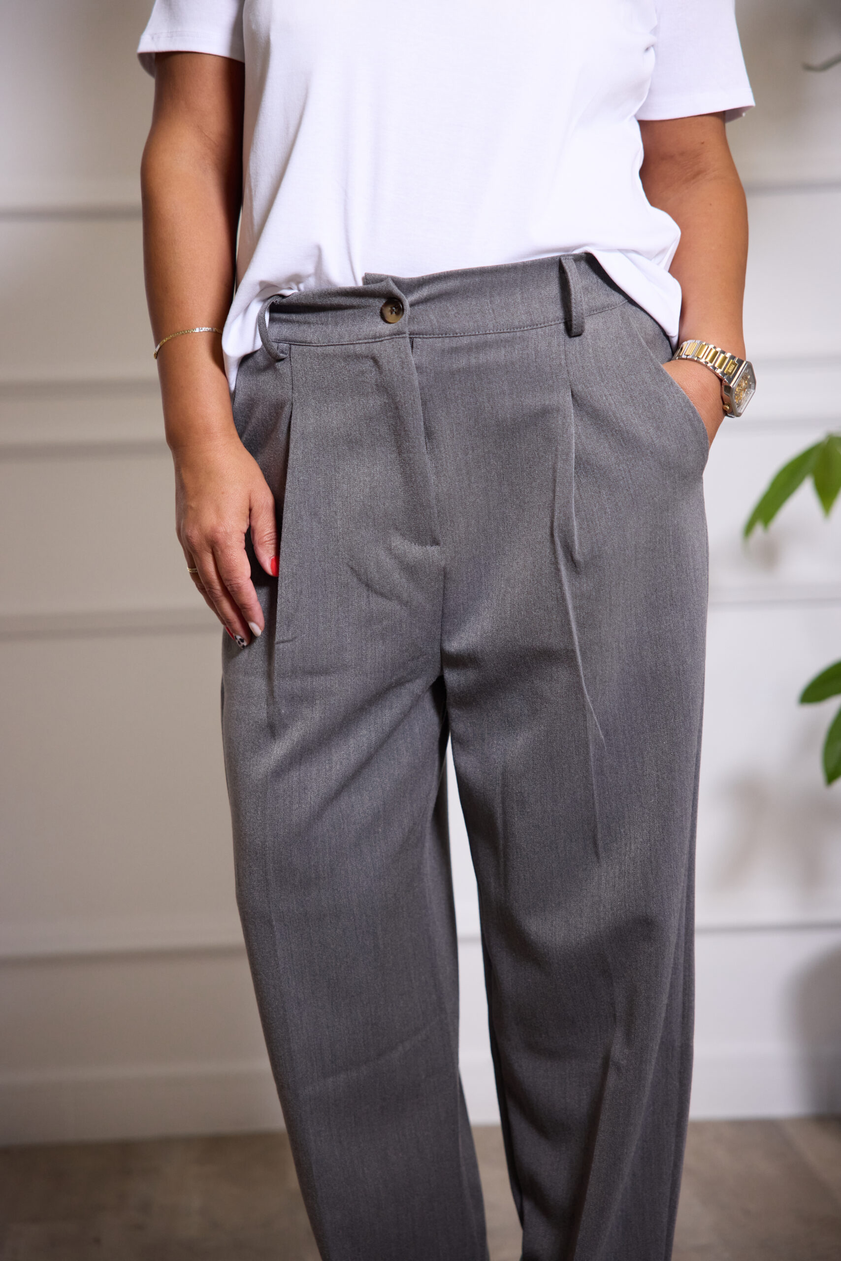 Pantalón de pinzas en color gris.