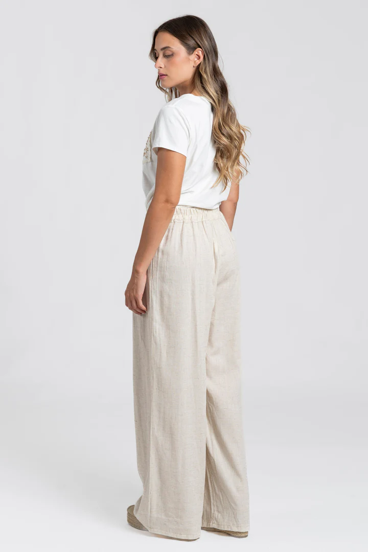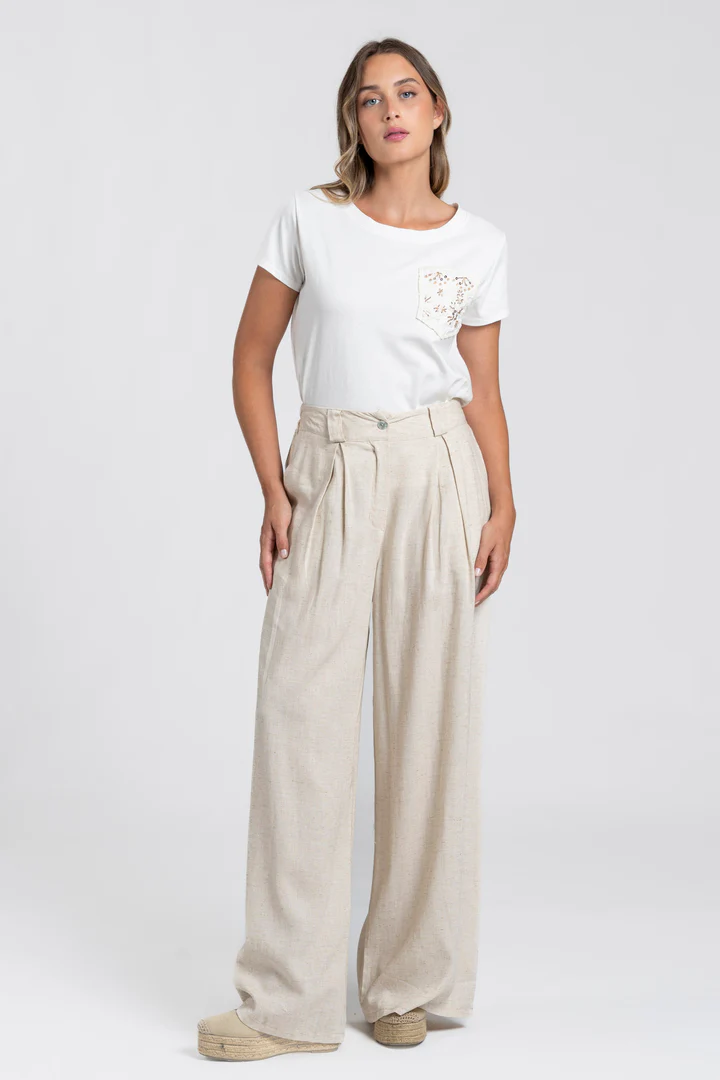 El tejido principal es una combinación de fibras que incluye lino, una fibra natural conocida por su frescura, transpirabilidad y textura ligeramente arrugada, lo que le da un aspecto sofisticado y relajado.