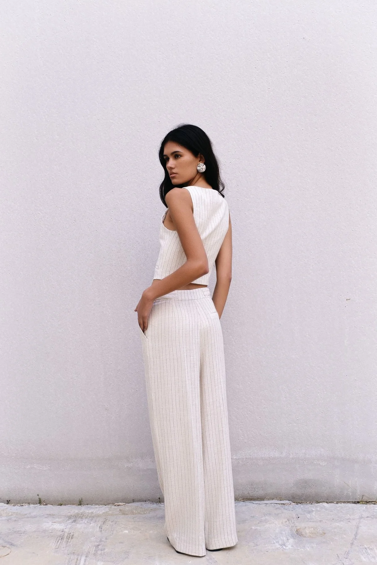 Pantalón de raya diplomática en tono crudo natural, pensado para un estilo elegante y relajado a la vez. Su caída fluida y corte recto estilizan la silueta, mientras la cintura limpia aporta un acabado sofisticado. Perfecto para llevar con el chaleco a juego o combinar con prendas básicas para un look versátil y atemporal.