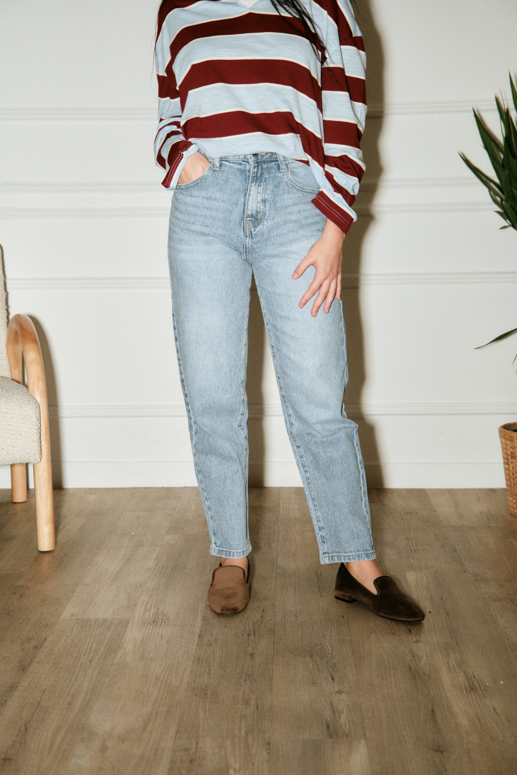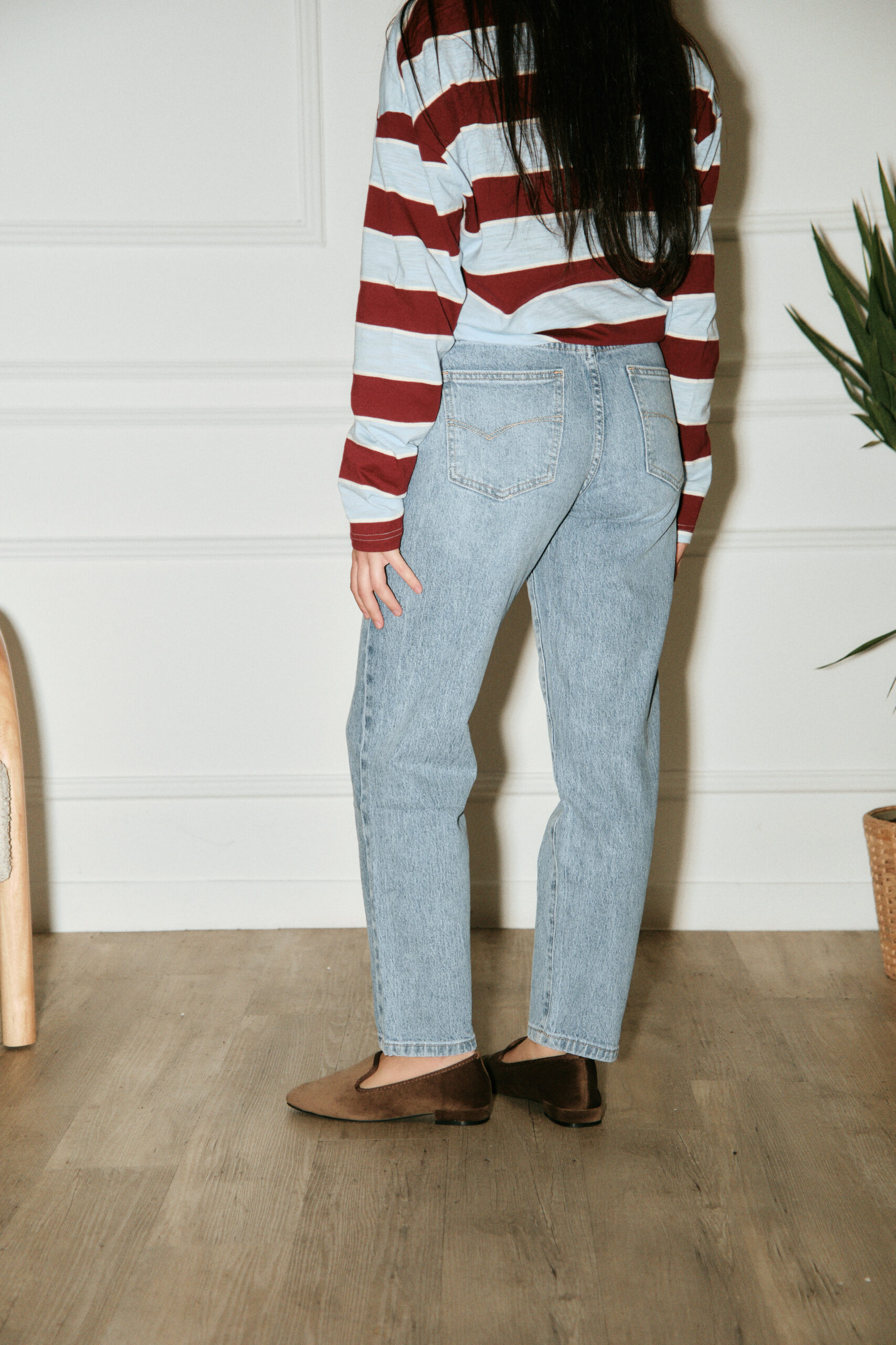 Vaquero azul claro de inspiración clásica con un corte recto que sienta bien y no pasa de moda. Su lavado suave y su silueta limpia lo convierten en un básico imprescindible para looks del día a día pero cuidados.