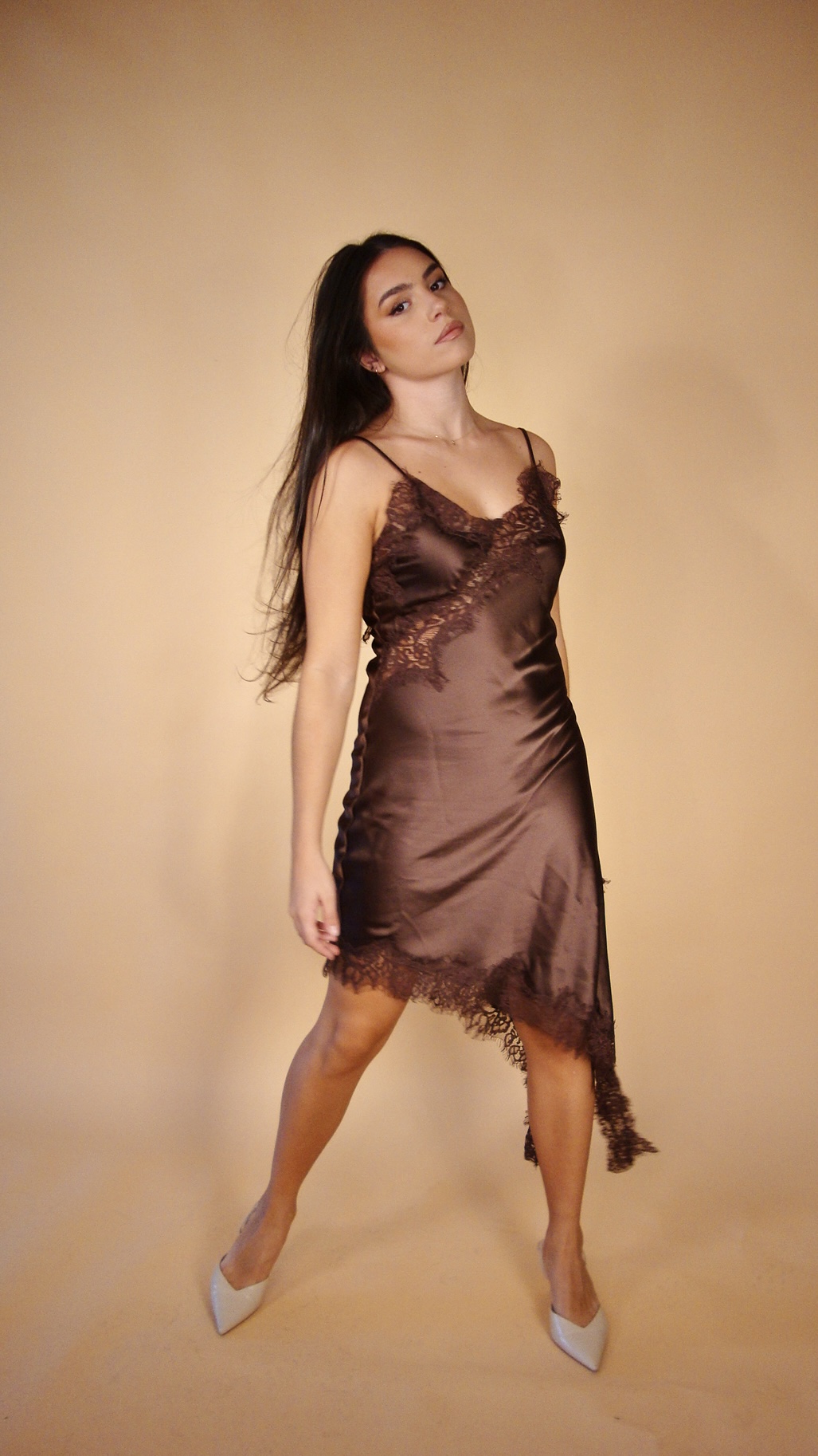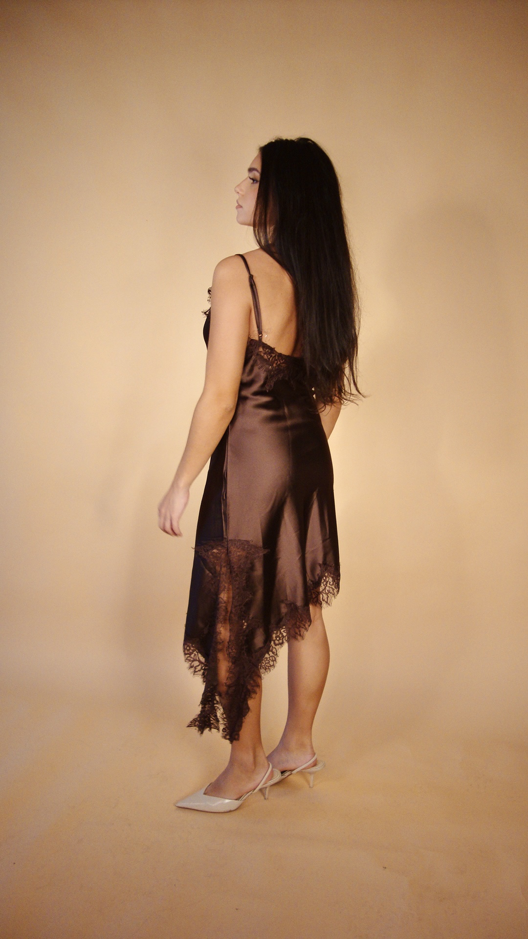 Vestido lencero de satén con encaje en color marrón chocolate.